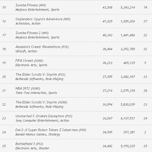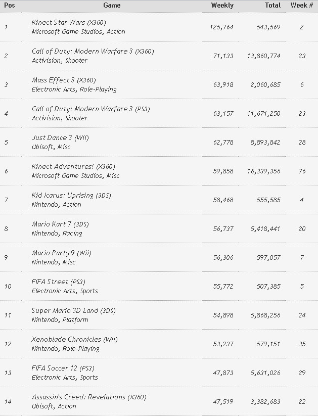 在排名前10位的游戏中,Kinect 星球大战(X360)以12万5764份销量占据头把交椅。使命 召唤:现代 战争3(X360)则以7万1133份的销量位居第二,质量效应3(X360)以6万3918份成为了销量前三。第四位则是销量为6万3157份的使命 召唤:现代 战争3(PS3)。舞力全开3(Wii)售出6万2778份位居第5。KINECT大冒险(X360)售出59858成为第6。新光神话(3DS)售出5万8468份位居第7。马里奥赛车7(3DS)售出5万6737份位居第8。排名第9的则是马里奥聚会(Wii),售出5万6306份。FIFA:街球(PS3)本周排名第10,售出5万5772份。