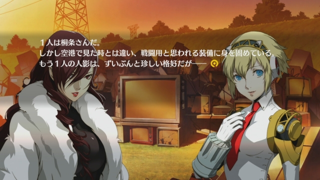 直斗跟踪在这个组织的领导,桐条美鹤的后面,但令人惊讶的是这位女性所到达的地方居然是稻羽。美鹤在城镇远处的废弃物厂跟看起来像是她同伴的人会合了。