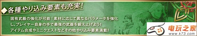 可强化现有的武器!与素材相应强化不同的数值,玩家亲手锻链出最强武器吧!物品合成及小任务等其他游玩要素满载!