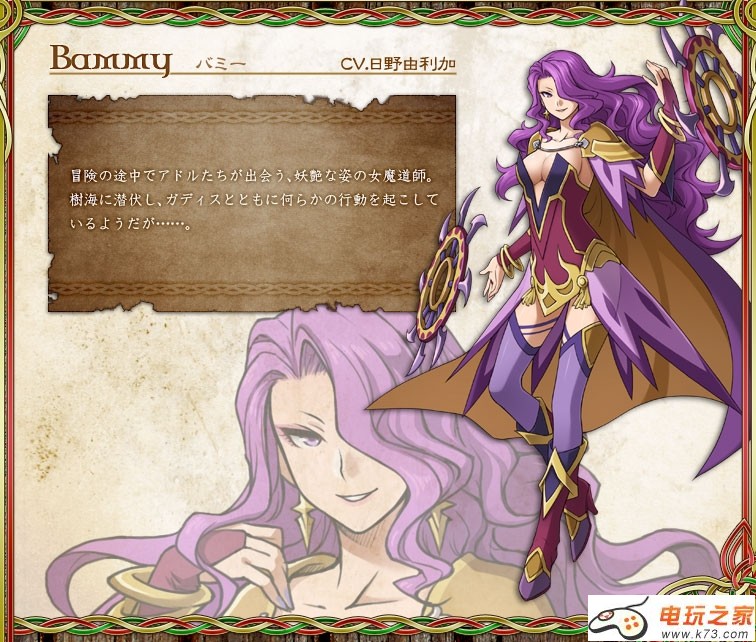在冒险途中相遇,有着妖艳姿态的女魔法师,潜伏於树海,与加迪斯一同进行什么行动的样子但……。