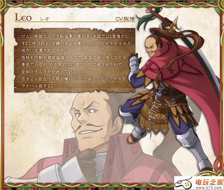 罗姆恩帝国塞尔塞塔驻留军的军团长,在本国被称为《雷鸣之雷欧》,曾为功绩显着的将军,但不知为何被贬职至塞尔塞塔地区。性格行动都是不顾一切往前冲的类型,梦见於本国东山再起,但被没干劲的部下们折腾,过着瞎忙的日子。很讨厌比自己更引人注目的人,视亚特鲁为劲敌。