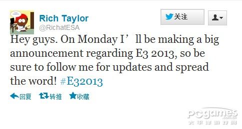 “在星期一,我将会公开一个关于E3 2013的大事件,请关注我并帮忙转发。”