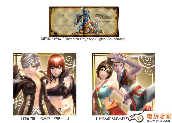 另外,还将会随首批出货,限量赠送游戏音乐的原声大碟「Ragnarok Odyssey Original Soundtrack」及可於游戏中使用的衣服「神枪手」的下载序号,此件衣服同时也装备了能大幅增加HP与AP的「神枪手卡片」,新手玩家肯定不能错过这个好机会!另外,在发售的两个月内,若於PlayStation?Store购买『Ragnarok Odyssey(仙境传说 奥德赛)』中英文合版的下载版,即可获得可於游戏中可使用的衣服「跆拳少年」的下载序号,此件衣服与「神枪手」不同,乃装备了能大幅提升攻击力与防御力的「跆拳少年卡片」喔!