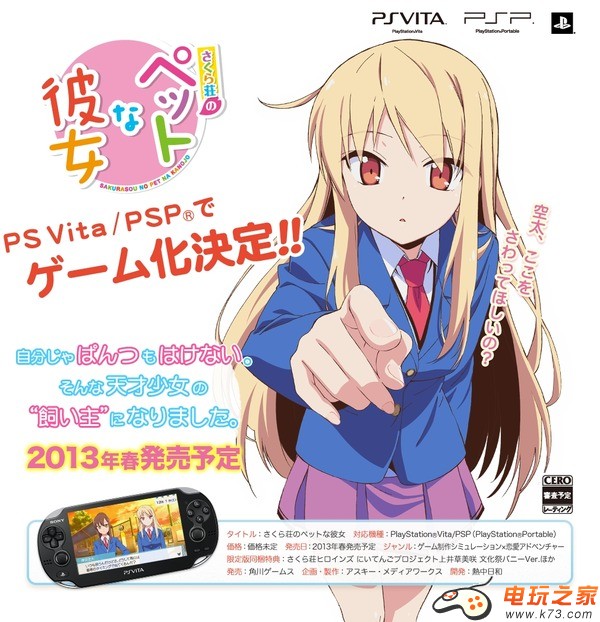 由鸭志田一所作的轻小说作品,樱花庄的宠物女孩,(さくら荘のペットな彼女),在10日于官方网站上公布PSV及PSP游戏化决定的消息并于明年(2013)春季予定发售。