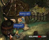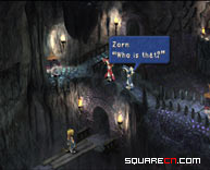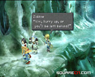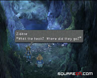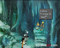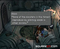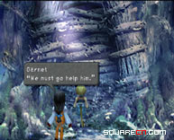 森林内,Vivi(ビビ)和Garnet(ガーネット)远远的从路上跑近,在走上一个坡时Vivi滑倒了。 “你没事吧?”Garnet上去将他扶起。 Vivi站了起来,惧怕地后退了两步,没有回答Garnet,而是问了另一个问题:“它——它又来了吗?” Garnet摇着头望着后面,这时森林中响起轻微的悉嗖的声音,地上突然映出一片黑影,飞快的向Garnet移去…… “当心!”随着Vivi的一声叫喊,画面逐渐转黑。 剧情回到Zidane这边,左边躺在地上的人身旁有个Phoenix Down(フェニックスの尾),控制他走入右下方的树洞。 |
