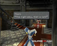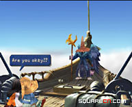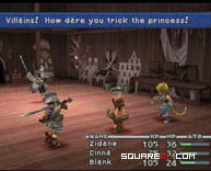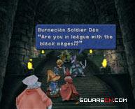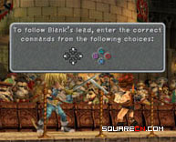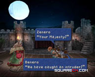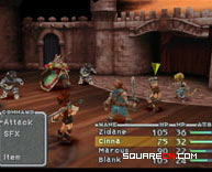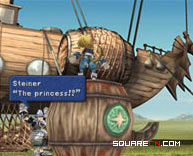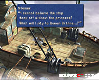 “Zidane,时候到了!”Baku吩咐一声,离开了。 Zidane按照计划,准备劫持Garnet离开,可是Steiner站在面前,显然,得先过他这一关。 和Steiner战斗。Vivi和Garnet会加入我方,他们一个会攻击性的黑魔法,一个会恢复性的白魔法,Garnet的召唤Summon(召喚)技能目前不能使用。 Steiner有167点HP,旁边的两个士兵攻击一下便会撤退。 在舰桥室里,Baku已经调整好引擎,开始启动剧场艇。 |