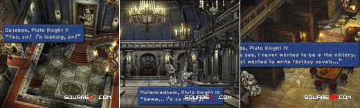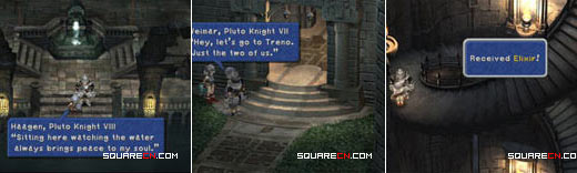 “骑士团的团员——集合!!!”只听Steiner一声令下,可却没有一个人出来,“呃,人都跑到哪里去了!?” 那两名起初被Blank和Zidane打昏的人似乎醒了,跑出来向团长报告:“一切准备妥当,大人!” “其余六个都到哪里去了!?”Steiner跑下楼梯,看到两人都没穿衣服,“什么?你们这些一点用都没有的饭桶!我从女王处接到命令,穿好衣服就跟我去找Garnet公主!” 控制Steiner进入那两个骑士走进的房间,会发现二人还在闲聊,将两人赶出去后可以在屋内发现Phoenix Down和一张骑士团名单。 现在的任务是先回去找女王要比剑游戏的奖赏,然后找齐8名骑士团队员。当然,不找齐也行,不过就无法获得Elixir(エリクサー)。以下是另外6人的位置: |