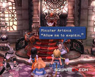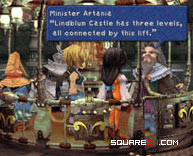 “要不是你那肮脏的白痴样子,他们才不会怀疑我们呢!” “嘿,我可不是那个只会扯着嗓子并穿着肮脏的锈盔甲的蠢货!”Zidane(ジタン)对Steiner的嘲笑毫不留情。 当他们还在争吵时,大臣Artania已经到了。 “见到你很高兴,公主请跟我走,大公正在等你。”原来Artania认识她,这下好办了。跟随Artania进入一个升降电梯,在乘坐电梯期间Artania为我们介绍了整个Lindblum的情况:它分为哪些区,电梯各通往哪个层。 很快地,我们来到最上层的皇宫和议会厅,这里一般是进不来的,然而有Artania领路,自然畅通无阻。 进入议会厅后,Dagger礼貌地向王座上行了一个礼。而等她直起身来时,却发现上面根本没有人。 |