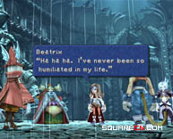 | 战术提示: “你必须先对付我们!”Freya转头向那名士兵说道,“我们会处理这儿的,你快去找国王,用你的生命去保护他!” “……谢谢你,Freya。”士兵愣了一下,随即跑开。 “哈哈哈……我从未这样被羞辱过。”Beatrix冷酷地笑了起来,“我曾一次单手杀死一百个勇士……对我来说,你们两个还不如一条小虫。” 和女将军对战,从BGM就可以听出她的实力有多强大,我方压抑地完全不能出手。这一战主要就是要坚持住,直到她最后使出一招将我方HP全部减为1的绝招,战斗才会以失败告终,如果中途我方被击败,则会GAME OVER…… 她的身上可以偷到Phoenix Down、Chain Plate(チェインプレイト)、Mythril Sword(ミスリルソード)。应该说,所有对手中女将军是最难偷的一个,很有挑战,试试自己的运气吧。 |