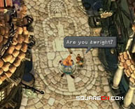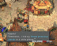 进入下一个场景——广场。 注意刚进来时会从下方走过一个河马,和它对话它会得意地告诉你:“哇哈哈,我将我的珍贵的三张卡片藏在了一个安全的地方!”这样在后面某个场景便可调查钟楼上的巨钟,并得到那三张卡:Fang、Goblin、Ironite(アイロネート)。需要注意的是这三张卡需要在发生偷梯子事件前去拿,否则就拿不到了。 在广场的上方左侧的手推车那里能得到Phoenix Pinion(フェニックスの羽),战斗不能后复活用的道具。 另外在合成店和装备店里能找到恢复MP的Ether(エーテル)和Remedy(万能药),Remedy可能比较难拿。在合成店的右上方的角落里,需要贴着柜台一点点往右走,稍微走过一点就会走进装备店。 |