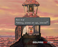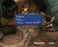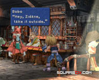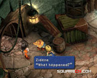 战斗开始,对手Masked Man(謎の仮面男)。这是整个游戏的第一战,是为了让玩家熟悉游戏的战斗系统的,在此可以参看专题部分的《战斗系统详解》一栏。可以从他身上偷到Potion、Wrist(リスト)、Mage Masher(メイジマッシャー)。这一场并不难,即使失败也没有关系。不过胜利的话能看到对手抱着头大叫的样子。 结束后,Baku(バクー)——也就是刚才我们和作战的那个人,Zidane所说的老大——会带我们去另一间房子开会。 “嘿,你们这班小傻瓜,看起来又有长进了!哈哈哈哈!好吧,我们现在就去开会!” (如果获胜时我方有成员处于濒死状态,Baku会提醒Zidane一行人“用个Potion补充一下!”,同时会赠予我方一个Potion。) |
