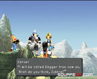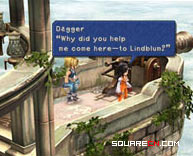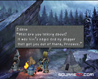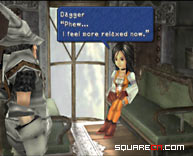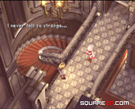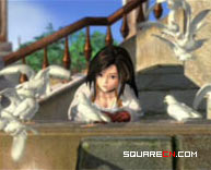 | CG动画: Zidane走上楼顶的台阶,看见一群白鸽围绕在Dagger的身边,她正在唱着那熟悉的歌声。 Dagger转回头蓦然地望了一眼Zidane,然后朝向天空,鸟儿都飞远了。 |