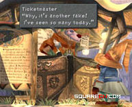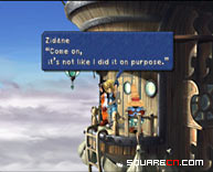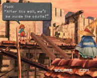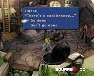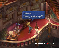 然而担心似乎是多余的,落下的Garnet手中牢牢拽着一根绳子,原来她是早就预谋好的…… Zidane见状随后牵起另一根绳子追了上去,所幸的是两人有惊无险,都安全落在了一个帐篷上。 然而尽忠职守的Steiner却没那么好运。将绳索绑在身上的他却一头撞向了一块木板…… Zidane在剧场艇上落下后,四处观望寻找Garnet,没想到Garnet却从天而降,踩在了他的身上。 在将乐队都撞得原地打转后Garnet逃进了一间屋子,控制Zidane走进去吧,邂逅才刚刚开始…… |