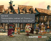 拿完物品后原路返回,在被撞到的那条街的左侧的两头,能各找到一个Potion。从街的右侧下方一个屋子进入,可以看见物主正在为出席今晚的演出做衣服,在房间内可以找到Potion、Fang(ファング)和9Gil。 继续往前走,在下一个场景可以看见一个导游正带领来自Treno(トレノ)的贵族们往城堡进发。 下方两侧的草丛中能找到33Gil和卡片Goblin(ゴブリン),对面的旅馆里也能发现Potion、Flan(プリン)和27Gil。 |