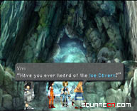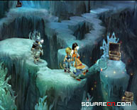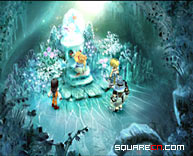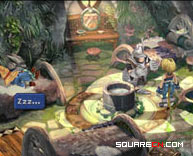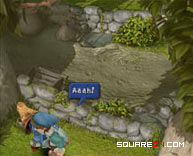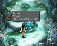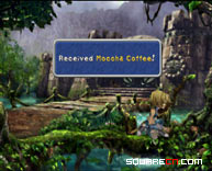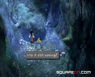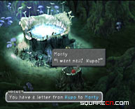 顺着公主被抓走那条路一直往前跑,一路上的怪物都很简单,只有Fang(ファング)和Goblin(ゴブリン)。 走过两个场景后来到一眼清泉的旁边,这里有只叫Monty(モンティ)的Moggle(モグ)正在喝水,看见人来了它立刻躲进树洞里去,和他对话可以存盘,另外还可以送出它Kupo(クポ)写给它的信。泉水处可以恢复HP和MP。 要注意的是,这之后的怪物会多出一种叫Dendrobium(デンドロビウム)的来,它的全体技能附带Darkness(暗闇)属性,中的队员会大幅降低物理攻击命中率,记得要及时使用Eye Drops(目薬)解除。 这之间有个CG动画和ATE事件: |