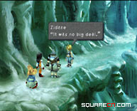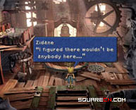 飞空艇外,Cinna发愁地看着到处都燃着火苗的飞空艇,Zenero(ゼネロ)正走出剧场艇,把一个个伤员丢在地上。“那些家伙们究竟在干些什么,整艘船都快要烧光了!” “他们还在找Garnet呢,”Zenero无奈道,“不过哪里都不见她。也许她掉下去了,剧场艇把她压住了也说不定。” “那就最好了。我们先是诱拐她,然后又把她杀死了。我们就是被判一百次绞刑也不够。”Cinna苦笑着说。 镜头下移,Zidane跳过沟壑向这边跑来。和Cinna互相问候几句后,树上的Moggle(モグ)飞下,发生ATE事件。 |