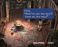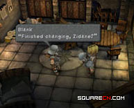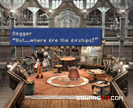 Baku来到一张放有城堡模型的桌子前:“现在说一下计划!Tantalus(タンタラス),声名狼藉的盗贼团(就是我们啦),现在正向Alexandria王国的方向进发……我们的任务是:把王位的继承人,Garnet公主,诱拐过来!” Cinna继续下去:“这里开始,就是我解说了。大家听清楚了!我们的剧场艇预计在Alexandria靠岸,到时候,我们就把戏服穿上,然后表演Alexandria最受欢迎的——‘I Want to Be Your Canary(きみの小鳥になりたい)’!可要注意点,Marcus(マーカス)!你可是做主角的!” Marcus:“包在我身上!当然啦,诱拐的任务就要交给Blank和Zidane了。” |
