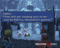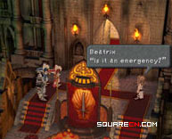 “我们要晋见女王!” “女王陛下现在很忙!等会儿再来吧!”骑士团团长说。 “有紧急的事情吗?”旁边一位佩剑的女性突然问道,她就是Alexandria(アレクサンドリア)有史以来最强大的战士——Beatrix(ペアトリクス),广场上的雕像就是为她修建的。 在得知公主的事情后,Beatrix立刻向女王作了汇报:“女王陛下,看起来Garnet公主把皇家项链一起带走了。” “呃,这样……她究竟在想些什么!?”Brahne(ブラネ)女王似乎更加重视那条项链,“Beatrix将军!还有……” 给那个骑士团团长起名,他本名是Steiner(スタイナー)。 “你们立刻去寻找Garnet!” |