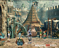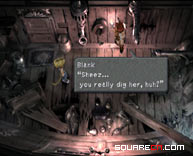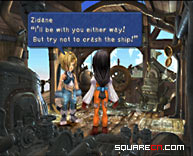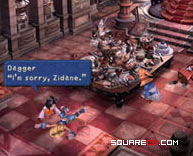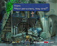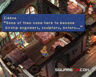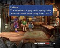 整个商业区相当繁荣,武器装备合成物品店都能买到许多好东西。旅馆里能找到163Gil,广场正中的房子里有Hi-Potion(ハイポーション)和Echo Screen(やまびこ草),合成店里有Silver Gloves(エスカッション)。 商业区的最下方能出城,想练练级为接下来的狩猎大会作准备还是必需的。 在武器店,可以看到墙上挂着的一把大剑,并听到Zidane说出一句很有争议的话:“我记得见过一个头发像钉子一样的家伙就用这种样子的剑。” 而“头发像钉子一样的家伙”究竟是不是指FF VII的男主角Cloud(クラウド),那就不得而知了。 |