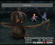 刚刚走过水洼地带就看到Vivi惊恐地倒退两步一屁股坐在地上,带着颤音说:“她——她有麻烦了……” Zidane往前一看:“……见鬼,那是什么东西?” 来不及多想,Zidane冲了上去,和Steiner(スタイナー)一同对付囚禁着Garnet的怪物。 战斗开始,Zidane因救人心切,首先会进入Trance(トランス)状态。进入这种状态的队员各项能力都会大幅度提升,有点像我们常说的“暴走”。这样的话Zidane就可以用特殊技能(选指令的第三项“Dyne(裏技)”)Free Energy(フリーエナジー)轻松解决对手Prison Cage(プリゾンケージ)。 关于Trance方面详细介绍请参看专题《Trance系统》。 |