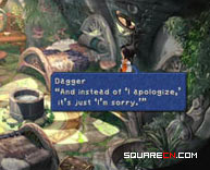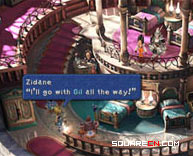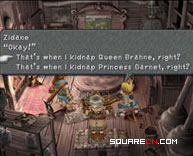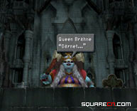 “我会用这些小虫虫来分散观众的注意力。”Blank掏出一只来,“这些虫子我可受不了……不过,我能行的!所以不用担心啦。到你了,Zidane!然后怎么办?” 现在有两个选择,第一项是“到我诱拐Brahne(ブラネ)女王的时候了,是吗?”;第二项是“到我诱拐Garnet公主的时候了,是吗?”正确的当然是第二项,不过如果你连选第一项3遍的话,Baku便会说:“好了,不要再开玩笑了!”连续选错到第64遍时,Ruby(ルビイ)便会走进来:“Zidane,你什么时候变成老顽固啦!” “对了!你将要诱拐的是全Alexandria最漂亮的女孩,Garnet公主!”Baku赞赏道。 |