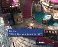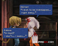 “对不起,请问你在等我吗?”女孩疑惑地说。 “是的!从我出生那天起我就一直梦见在这儿等你!” “你在笑话我吗?” “没有,当然没有……” “那就好,我要告辞了!”她想离去,却被Zidane拦住。 “嘿,再等一下!我们以前见过面是吗?” “不,我不认识你……” “呃……”Zidane绕着她转了一圈,“也许你说的是真的……不过我可不会让一个像你那样漂亮的女孩离开。” “这么说,你不让……”女孩似乎有些着急。这时楼下的Blank走了上来:“嘿,Zidane,进展如何?” 趁着Zidane一不注意的时候,女孩立刻冲下楼,把两人撞得原地打转。 “刚才谁撞的我!”Blank生气地问。 “快起来Blank!刚才那个是公主Garnet(ガーネット)!”Zidane从那女孩不谙世事的言行上立刻察觉出不对,随后紧追上去。 |