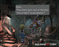 当Zidane等人醒来时,Dagger和Steiner早已不在了,没办法,我们现在只能继续前行。 乘电梯来到最底层,坐左边的那辆车来到地龙之门(Lindblum's Dragon Gate,リンドブルム地竜の門)。 门口有个商人可以买道具,还有个莫古Moonte(モンテ),它可以收到来自Stiltzkin(スティルツキン)的信。 出去后我们再次来到雾之大陆上,一切仍显得那么平静。但是这背后,究竟隐藏着什么样的危险?还有Dagger,她为何要那样做? Zidane无时无刻不在被各种各样的事情所困扰着。 |