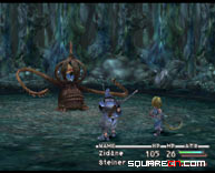 值得一提的是,如果先前与Baku战斗中偷到Mage Masher(メイジマッシャー),在这场战斗中,千万不可使用攻击全体的第2个Trance技Tidal Flame(タイダルフレイム),否则将误伤公主。战斗中Prison Cage有时会吸收公主的HP(一次20左右),注意在必要时使用Potion(ポーション)给她回复HP。这家伙是个穷鬼,就不必偷东西了。 胜利后怪物会带着Garnet逃走。众人眼睁睁地看着他们离开,却无能为力。 “她不见了……我吓得无法施展咒语……那怪物可能会吃了她……”Vivi沮丧地说,都怪自己胆小。然而现在不是自责的时候,因为另一只怪物又突然袭来,像抓住Garnet一样抓住了Vivi,再次发生战斗。 |