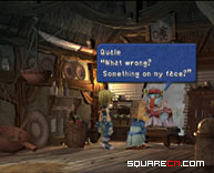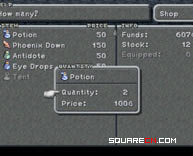 出来旅馆继续向左走,和左边的站着的人对话他会让你去广场的售票处看下。 右边商店的地板上可以找到38Gil。 和柜台里的老板对话,便会出现一个对话框,三个选项依次为“买、卖、取消”。选择“买、卖”便会进入交易状态,这时控制手指上下移动便是选择交易的物品,按确定键后会出现确认对话框,里面有两个数值:上面是买的数量,按左右键可以1为单位调数量,上下键以10为单位调数量;下面的是需要的总钱数。再按一次确定键便会交易成功。 可供选择的物品栏右侧也有三个数值:当前拥有的钱数、所选择物品的拥有数和装备数。 |