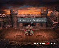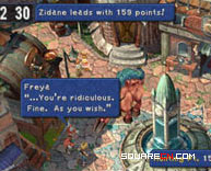 在一处城墙上,可以看到Dagger和Steiner(スタイナー)在为Vivi加油。 Zidane来到剧场街,狩猎大会倒计时正式开始。这一战无论谁获胜,剧情都是不变的,只是得到的奖品不同而已。狩猎时左上方的数字即倒计时时间,右下角是你目前取得的分数,正上方的字则是谁目前分数排第一。 建议先在剧场街和工业区里狩猎,在大约还剩4分钟时,去商业区的最深处,这里将会遇到那只Zaghnol,它是取得狩猎大会冠军的重要因素。如果想要Zidane赢的话,在与Freya并肩作战时KO了她就行了,反过来就能让Freya获胜。想让Vivi赢就两个人都自杀…… |