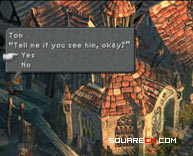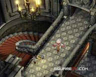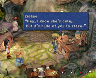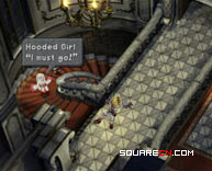 “据侦察所得……王室成员的位子应该就在这楼梯上面!”Blank(ブランク)告诉Zidane(ジタン)说。 “前进!”控制Zidane走上楼梯。刚到第二层,一侧的门突然被打开,一个身穿白魔道士服装的蒙面女孩冲了出来,险些和Zidane撞上。 “呃?她穿戴的可够奇怪的……”Zidane心里想。 “唔,请问你能让我从这儿过去吗?”女孩支支吾吾地问。 这里有两个选项,第一个是“让她过去”,第二个是“仔细看看她的脸”。选哪个都无所谓,但第二个比较符合我们主角Zidane的性格,搞笑的对话也多了一段。 “让我看看……”Zidane侧着头端倪起来。 “我的脸上有什么不对吗?”女孩问。 “呃,没有。你看起来……”Zidane似乎想起什么,“我正想呢,你可能就是我等了许久的人啦。” |