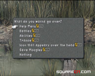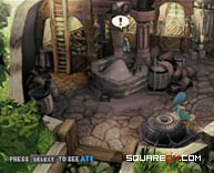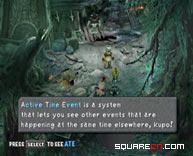 | 系统说明: 在游戏过程中,经常会出现ATE(Active Time Event),也就是让玩家看到同一时间段里不同地点发生的事,也包括了一些不在队伍中的角色的事件。当屏幕左下角出现(Active Time Event)字样时便可按“select”键选择要看的ATE。还有,ATE是分两种的:一种是蓝色字样,玩家可看可不看;另一种是灰色字样,这样的ATE无法回避。ATE对玩家了解剧情会有很大帮助。 Moggle:“试试按下选择键‘select’吧,库啵!” 按下“select”键后出现小窗口选项,选择确定后画面转移。 |
