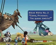战斗结束后,Black Waltz No.3丢下一句:“你们这些混蛋……我就是为了杀戮而存在的!”然后飞走了。 看着周围的景物,Zidane想:“我看见南大门了…她还是决定去那!”这么想着他向驾驶室走去。Vivi却还在那里看着甲板边挂着的死去同伴的帽子。 另一边,Black Waltz 3飞空艇上的2个皇家小丑发现战败了的Black Waltz 3向他们飞来,连忙跳出飞空艇。 “我只为杀戮而存在……”Black Waltz 3回来后只是这样反复地念着,明显已经失去控制。 |