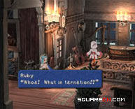 第二天早上Zidane在旅店里醒来。 “早上好,”Vivi(ビビ)推门走进来,“Lindblum可真是个繁华的地方啊,我从未见过着么多的人。” “Lindblum总是这样,这里的人们来自世界各地。我甚至都记不起来我第一次为什么来这里,我只知道在这里,我和Tantalus的弟兄们在一起。” “他们仍住在这里吗?” “恩,我们的本部在剧场区,我现在就去那里,你来吗?” “不用了,我想去城里逛逛。”Vivi走出房间。 接下来浏览一下整个城市吧,有很多物品和ATE都在等你。旅店里的莫古还有一封Ruby(ルビイ)给Zidane的信。 |