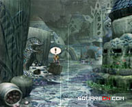 来到一个院子内,先进下面一层的门救一个险些被雕像砸着的鼠裔族男子,Zidane劝说他们去Lindblum(リンドブルム)避难,他们答应了。在以后的剧情中也确实遇到了他们。 之后从上面一层左边的门进入,门口两个宝箱是Tent(テント)和Phoenix Down(フェニックスの尾)。右边尽头的宝箱是……冒牌货…… 继续前行到一个广场,左边的门内能拿到Freya的专用武器Mythril Spear(ミスリルスピア)。右边门内的箱子里放着Lighting Staff(雷のつえ)。那里还有两只莫古,Atla(アトラ)不仅可以存盘休息寄信,还能从它那买得一些物品。 Stiltzkin(スティルツキン)则可以固定地卖给你一些道具。 走出广场,来到一处巨大的雕像前,它已经破碎不堪了,而且堵住前进的去路。 |