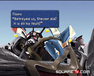 CG动画。 女王气急败坏地命令炮手发射铁锚将剧场艇拖住,被铁链锁住的剧场艇在空中摇摆不定。 “轰——”的一声,艇的尾翼撞到了一幢建筑上,建筑里的人们惊惶失措,四处逃窜。剧场艇摇晃地更加厉害,撞到了更多的房屋,整个晚会上的人们都吓坏了,现场一片混乱。然而更可怕的在后面,Brahne又疯狂地打开了一扇门,用里面的一尊巨炮放出一个巨大的Bomb(ボム)来,歇斯底里地叫着要将剧场艇轰下来。 再次和Steiner发生战斗。这场战斗其时不用打,无论胜负一定回合后Bomb便会引爆自己,所以一直防御就行了。 |
