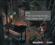 回到那个巷子,跟着鼠裔族来到下个场景,先不要随他进到屋子里,先往下走,这时可以看见身后一个小女孩从房间里跑出来。进入那个房间便可拿到Eye Drops(目药)和3Gil。如果不等小女孩跑出屋的话,那3Gil是无论如何也拿不到的。 出屋子来到最下面的河边,和那个小孩对话他会让你帮忙寻找丢失的小猫,可以在最初的那个有雕像的广场找到。 完成任务后再回去和他对话,为了表达谢意,他会送给我们一张Bomb(ボム)卡。 |