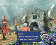 离开地龙之门,再次来到雾之大陆。一路北上,走不远可以看到一片沼泽——Qu's Marsh(ク族の沼)。进去后会发现这里就是那莫古教学的ATE发生地点。 在深处的一片沼泽旁,有一个奇怪的人正在那里念叨着好饿。去上面的水塘旁边抓一只青蛙过来再和她说话。那人会问Zidane(ジタン)要青蛙,在给她命名为Quina(クイナ)后把青蛙交给她。这时Quina的师傅Quale(クエール)出现把众人带进了沼泽中的房子里。 “吃的艺术不仅仅在于捕捉青蛙,”Quale这样说着,“世界是很大的,有许多许多食物,你应该出去见识见识,尝尝其他食物。”Quale转向Zidane:“旅行者,带上Quina去了解世界吧!” 出现选项,建议选择第一项,这样我方便满足4人了。 “为什么不呢?”Zidane摊开手做了个很潇洒的动作。 |