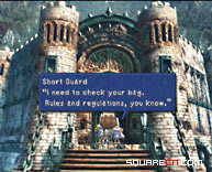 故事情节叙述到Dagger(ダガー)这一边。 南大门前站着两个守卫,Steiner(スタイナー)扛着一个大包裹出现在画面里。他想穿过大门,但被守卫拦住了。 “给我停下,”守卫问道,“你是来干什么的?我要检查你的行李,照章办事,你是知道的。” “见鬼,我必须要做些什么!”Steiner把包裹放在一边,不安地想着。 “警方正在搜寻一个女孩及一名中年男子,”守卫继续说道,“那个女孩据说很像Garnet(ガーネット)公主。” “恩,这是什么!?”检查包裹的守卫插话道,“那些是……腐烂的东西!它们是毒药吗!?” “腐烂?我可没带任何已经烂了的东西……”Steiner努力装出一脸惊讶的表情。 “哦!这是Lindblum(リンドブルム)的特产,我不敢相信你竟带了这么多!” “它是我的最爱!没有它们我可活不下去。” “恩,喜欢它的人都这么说。”从话语可以听出他似乎也很喜欢那种特产,“你可以通过了。”守卫让开了道路。 |