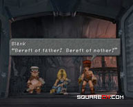 场景切换至后台,Cinna(シナ),Zidane(ジタン)还有Blank(ブランク)正在背诵台词。 Blank:“丧父之痛,丧母之痛啊!Marcus,你连最心爱的人都失去了!” Cinna:“运气已经离我们而去了!我们还怎么活下去?” Zidane(ジタン):“为了我们的友情……让我们把剑深深地刺入那卑鄙无耻的国王的心脏里去吧!” 三人举起剑,冲到舞台上,站在Leo国王的面前。Blank:“我会在背后支持你们的!” Marcus:“请把你的剑收起来!这个奸贼,有我一个人来收拾就行了!” Cinna:“别这样,我的战友!因为,我的兄弟,也是被这奸贼杀死的!” |