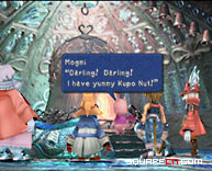 绕过一圈来到一个大钟旁,一只莫古正在那里焦急地喊着他的伴侣。 “没想到在这里遇到莫古,发生什么了?”Zidane等人走过来问道。 “我的老公,他在这个铃铛里困住了!”Mogmi(モグミ夫妇)哭泣着,“我们才在这里完婚,然后有几个小丑攻击我们!我好害怕!”。它边说边走近众人,接着它发现了Vivi身上的Kupo Nut(クポの実)。 出现选项是否给它果实,选第一项给它。 拿到果实的Mogmi高兴地跑去告诉它的伴侣有果实,结果只见那钟震动了两下就给那只莫古从里面掀开了。两只莫古在道了谢后离开了。 “好疯狂的一对儿!”Zidane感叹道。 |