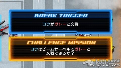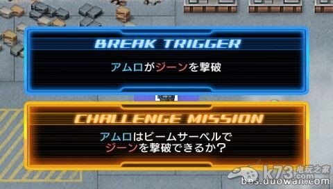 Break1:基友交战,如果不想挑战任务的话,其实是很简单的,一出来直接GP01冲前激光枪就可以了。如果要挑战的话就不用那么急,卡多会逃走的,让他逃,慢慢追。直到右边沙漠,此时卡多会跑不了的(等基友过来)。然后用GP01的光束军刀一砍,KO。