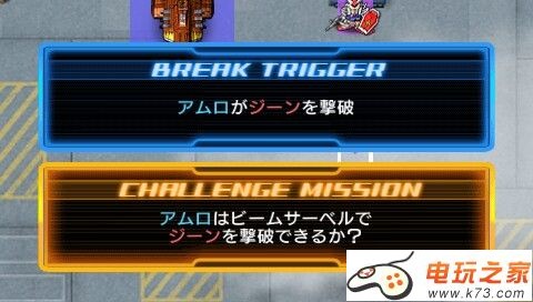 这关小兵有点多啊,注意走位,以免被围殴(我的GP01啊!TAT)达成Break条件后宝中尉的瓦多姆出现在下方,罗兰的胡子出现在上方。Challenge格拉汉姆的Overflag出现在上方。