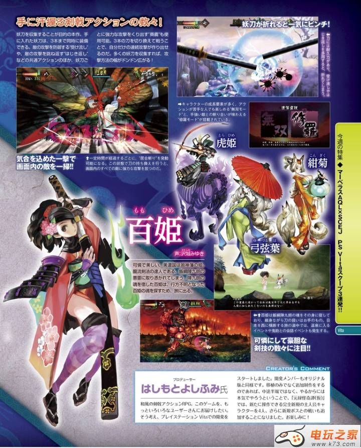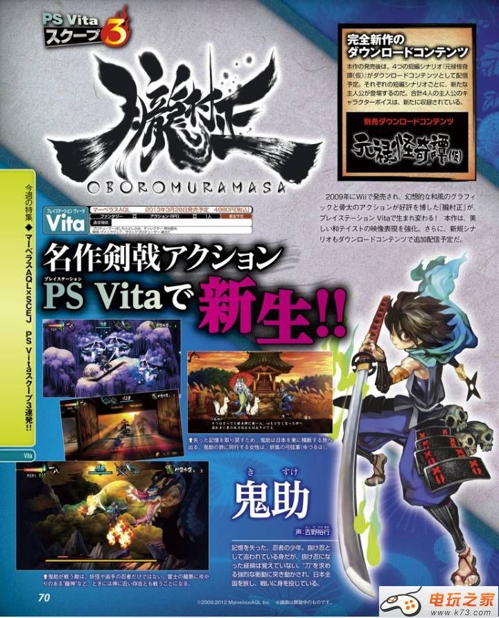 PSV平台作《胧村正》由原WII版移植成来,原作以精美的水墨画风和爽快的动作要素吸引了大批动作爱好玩家的喜爱,官方宣布PSV版将加入全新的要素。游戏中玩家将操纵主人公鬼助和百姬,为寻求名刀与武士以及妖魔展开殊死搏斗。下面是官方放出的最新杂志图,图中公开了游戏多个场景画面和多位角色形象图。