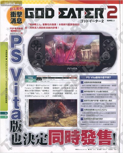 PSP/PSV双平台游戏《噬神者2》公开了最新的中文杂志图,自从TGS2012公布本作会出PSV版本以来,很多玩家非常期待PSV版的表现,下面杂志中将对此版本作出了详细的介绍,同时介绍了游戏系统和角色方面的情报。