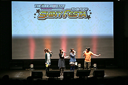 活动最初出现在舞台上的是,声优今井麻美(如月千早役),沼仓爱美(我那覇 响役),以及浅仓杏美(萩原雪步役)共三人。也许有人马上就联想到,这三位分别是《偶像大师 闪耀音乐祭》游戏的三个版本的代表角色。也就是说她们是以《偶像大师 闪耀音乐祭~甜美之声~》《偶像大师 闪耀音乐祭~跃动音符~》以及《偶像大师 闪耀音乐祭~奇蹟旋律~》的登场偶像为代表而站在舞台上的。