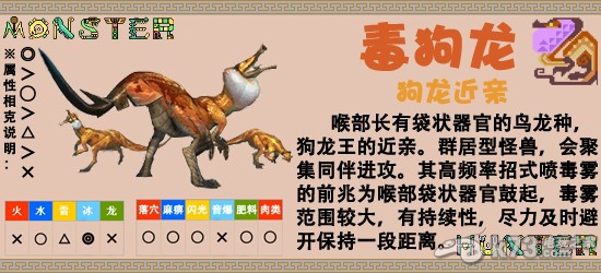 同为鸟龙种的毒狗龙与狗龙王算是血缘亲属了,其长相和攻击方式也基本相似,他们都是属于初期首领级别的怪物,是每个新手猎人必须经历的阶段性怪物,下面就给大家这只怪物的详细资料和打法。