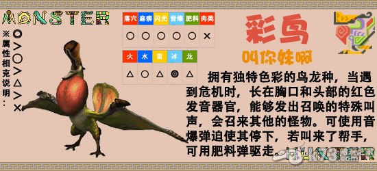 相信很多自《怪物猎人P3》开始接触怪物猎人系列的玩家第一个被卡住的怪物就是彩鸟吧!这只怪物的能力非常不错,其撞击打火石蓄力一定要掌握好时机进行翻滚或者加速跑动,不然非常容易中,之后还会有燃烧效果。不仅如此,它还会召唤狗龙王或者雌火龙为其战斗,非常的棘手,下面就给大家带来这只怪物的详细资料和打法心得。