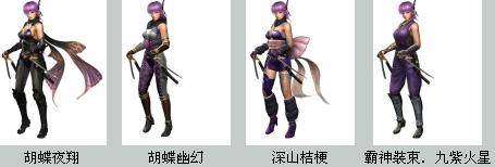 而在这次官方所公布的新服装造型方面,包括有女忍者绫音四种造型服装,如适用於夜间潜入工作,泛用性很高的隐藏服装胡蝶夜翔;以及适用於武器战斗,之前NGΣ2也曾经收录登场的胡蝶幽幻;与其说是忍装,不如说比较接近铠甲,但在各部位还是有花费工夫去设计而不失原本隐密性的NGΣ1服装深山桔梗;以及最後由DOA系列采用过来,霸神门正式忍装之一的霸神装束.九紫火星等等。