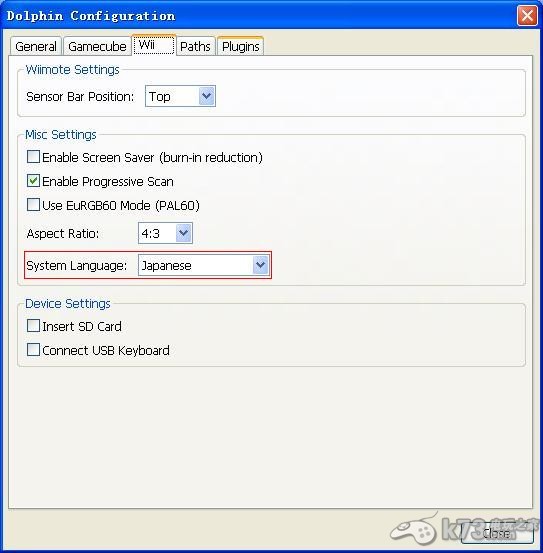 2.在“Dolphin Configuration”中的“Wii”标签下的“System Language”选择“Japanese”,否则读取游戏就黑屏了,具体的已在相关图中的红框标明了(见下图)。